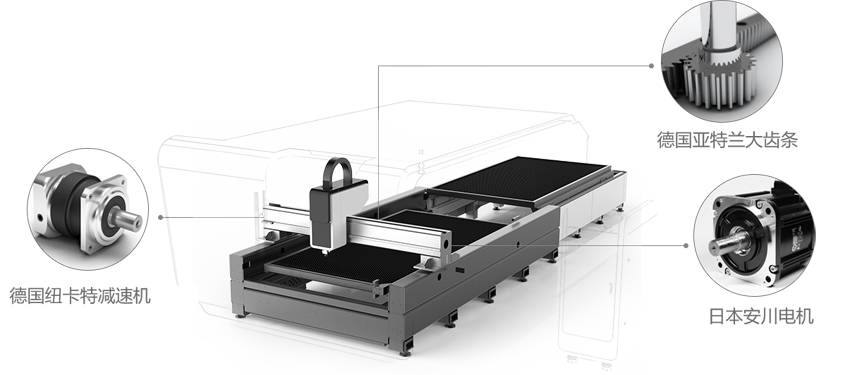 光纖激光切割機配備德國亞特蘭大齒條、日本安川電機和德國紐卡特減速機。 機床的定位精度為0.02,切削加速度為1.5g,工作壽命可達10年。