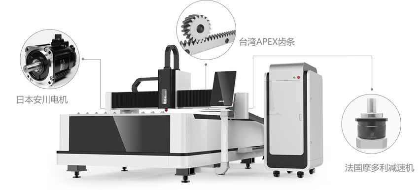 金威刻光纖激光切割機采用日本安川電機、臺灣上銀齒條、法國摩多利減速器。 機床的定位精度為0.02。