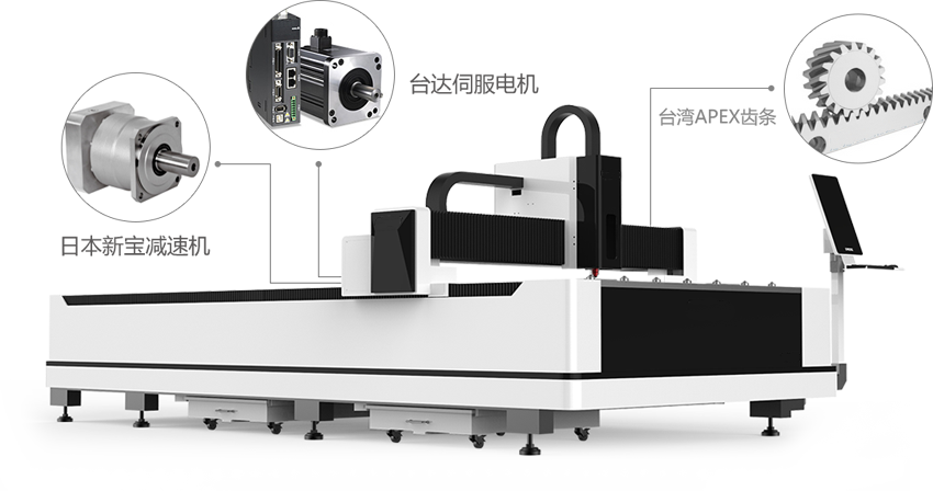 金威刻光纖激光切割機配備臺達伺服電機,日本新寶減速機和臺灣APEX齒條。 機床定位精度可以達到0.02mm,工作壽命超過10年。